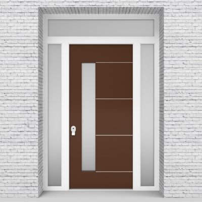 Single Door with Two Side Panels and Transom 4 Aluminium Inlays with Lock Side Glass Chocolate Brown Security Doors