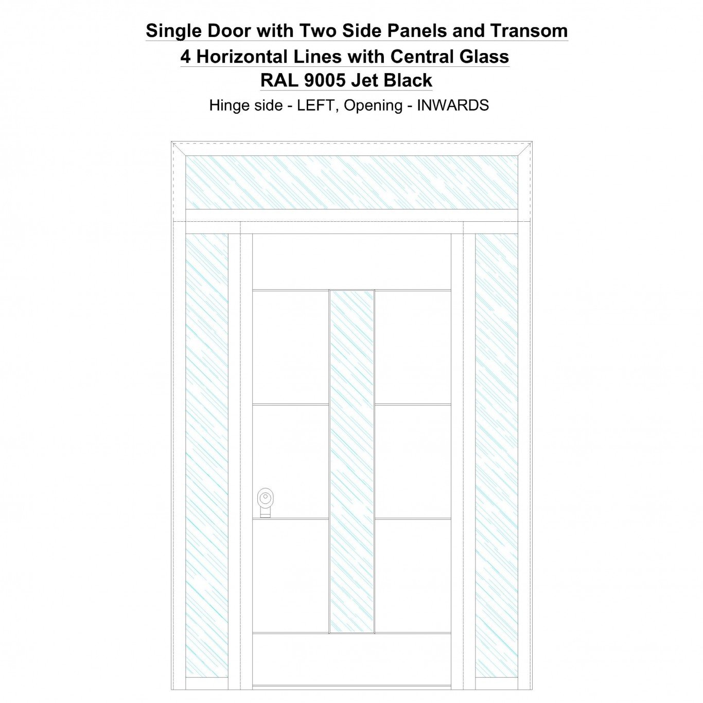 Single Door with Two Side Panels and Transom 4 Horizontal Lines with Central Glass Jet Black Security Doors