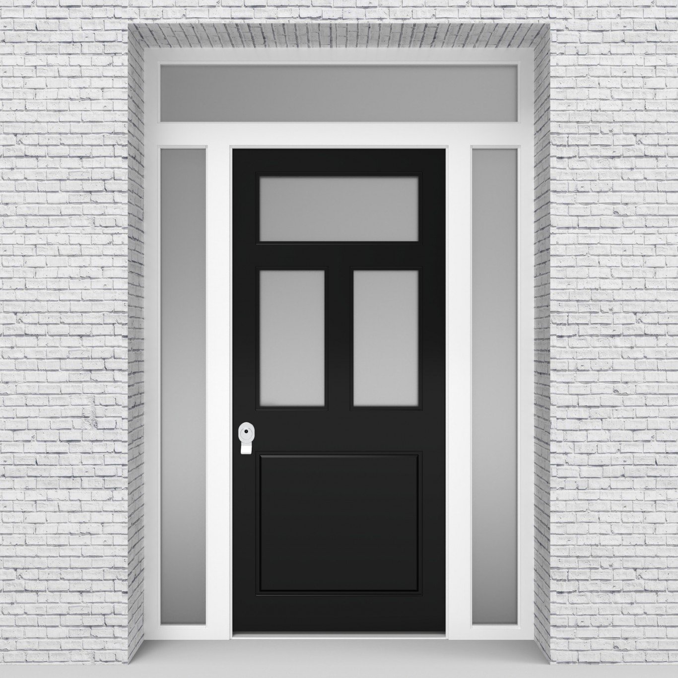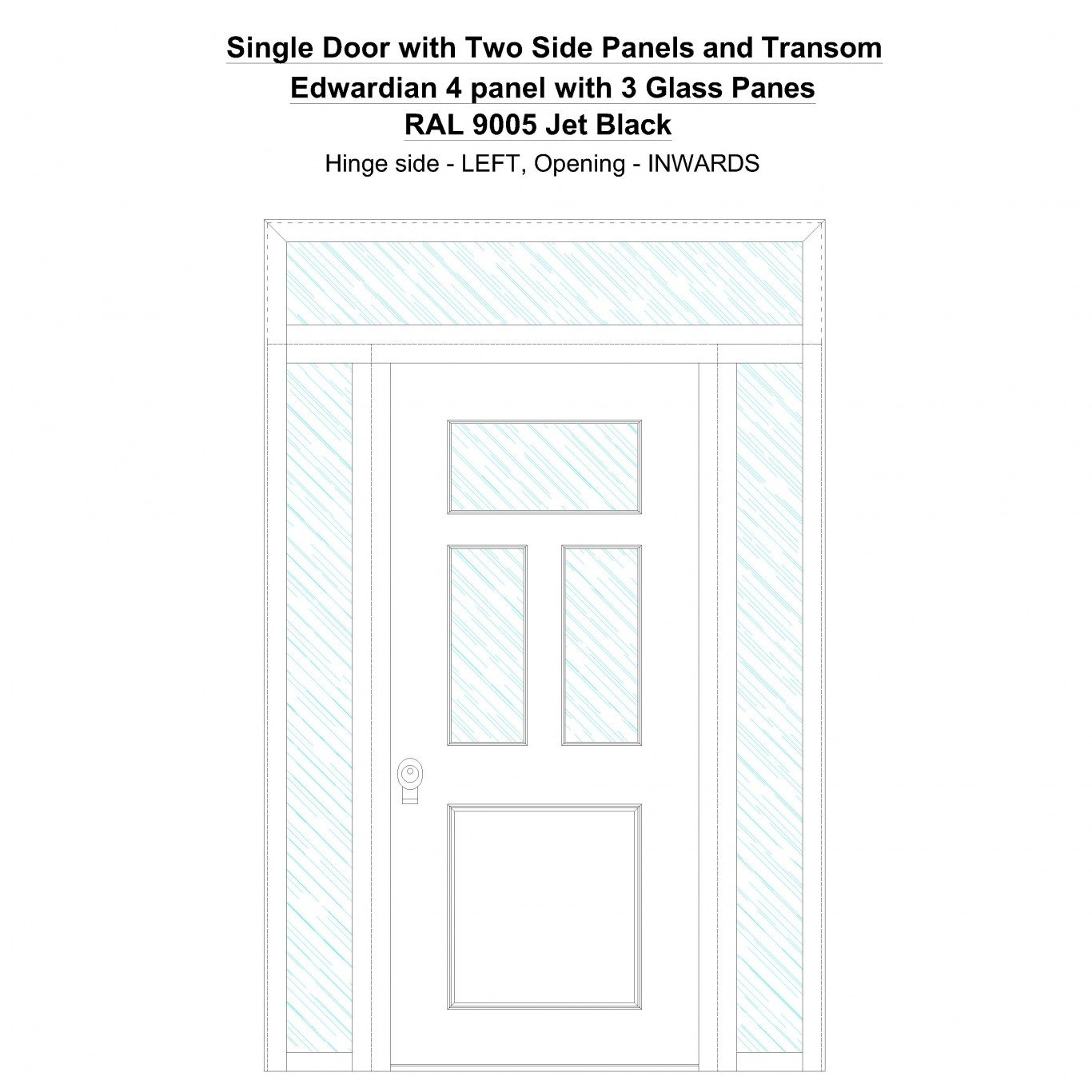 Single Door with Two Side Panels and Transom Edwardian 4 panel with 3 Glass Panes Jet Black Security Doors